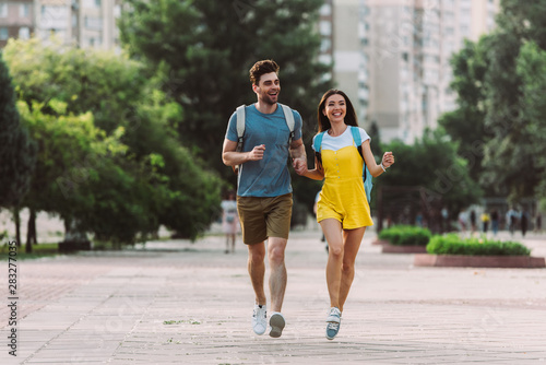 handsome man and asian woman running and looking away