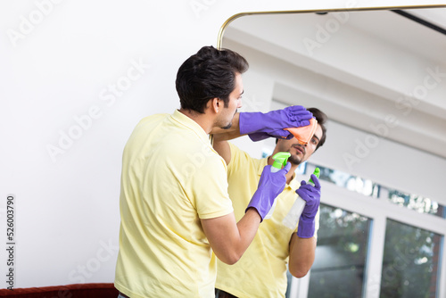 Handsome man cleaning mirror at home. Male contractor from cleaning service in yellow t-shirt and violet rubber gloves holding a rag and spray and wiping the mirror