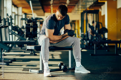 Handsome man doing biceps lifting dumbbells on bench in a gym