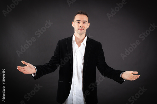 Handsome man doing different expressions in different sets of clothes: welcome