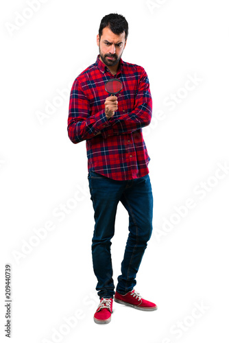 Handsome man holding a magnifying glass