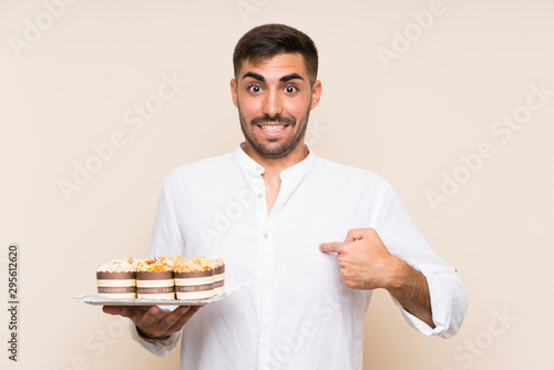 Handsome man holding muffin cake over isolated background with surprise facial expression