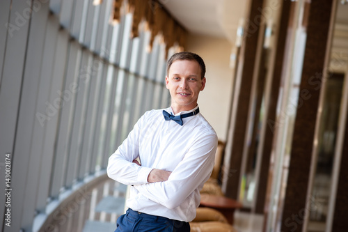Handsome man in a white shirt in the interior.