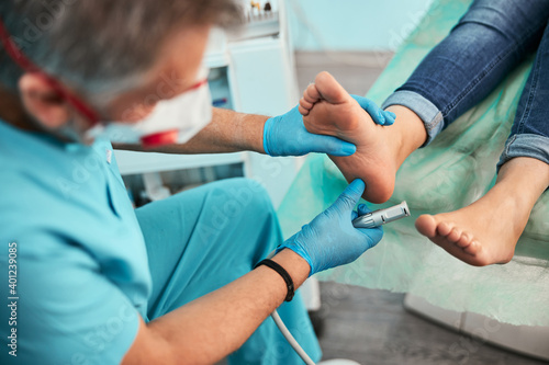 Handsome man in blue gloves holding left foot in hand while doing hard skin peeling in medical center