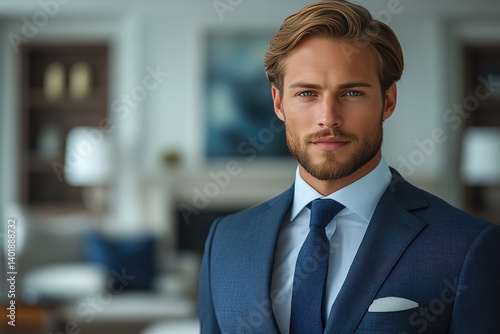 Handsome man in suit, sharp blue eyes, blonde hair, in a blurred background