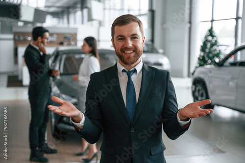 Handsome man is standing in front of his coworkers. Three people are together in the car showroom