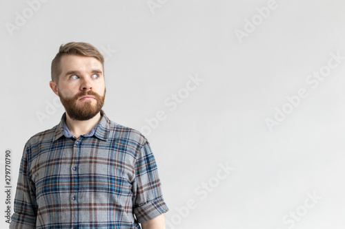 Handsome man making bulging eyes in surprise against a white background with copy space. Concept of surprise and uncertainty.