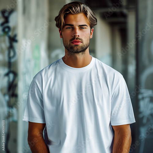 Handsome man model plain flat smooth white, strong man in a blank white shirt for a mockup