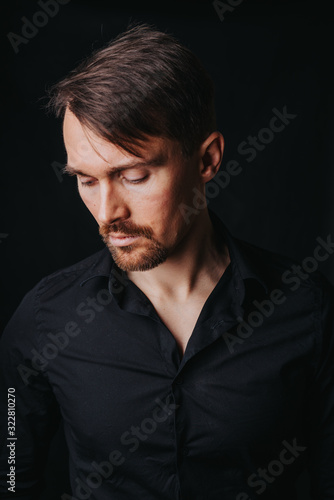 Handsome man. Photo in a photo studio on a black background. A young man expresses his emotions with expressions, gesticulation and attitude.
