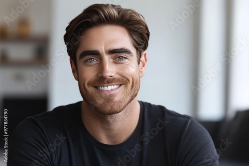 Handsome man smiling in a modern setting symbolizing confidence positivity and a successful mindset Bright and professional environment enhances the uplifting mood