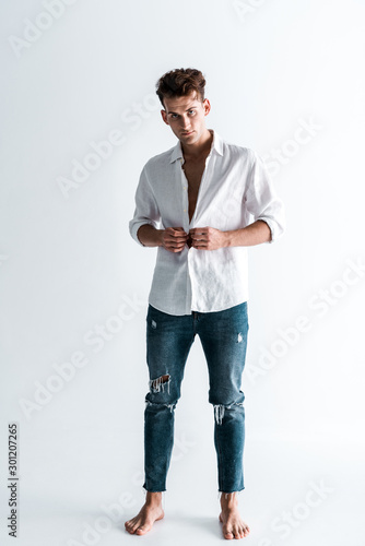 handsome man standing in blue jeans and touching shirt while undressing on white
