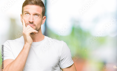 Handsome man wearing casual white t-shirt with hand on chin thinking about question, pensive expression. Smiling with thoughtful face. Doubt concept.