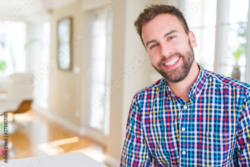 Handsome man wearing colorful shirt and smiling positive at the camera