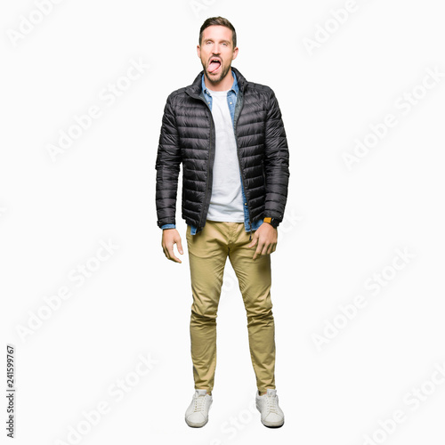 Handsome man wearing winter coat sticking tongue out happy with funny expression. Emotion concept.