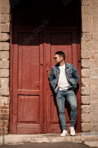 Handsome man with a beard in a denim jacket and denim pants stands near red vintage doors. Grown guy in denim style
