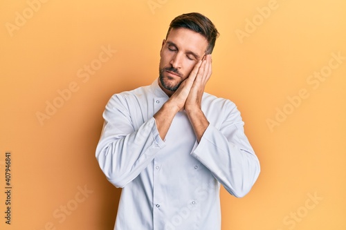 Handsome man with beard wearing professional cook uniform sleeping tired dreaming and posing with hands together while smiling with closed eyes.