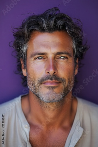 Handsome man with expressive blue eyes and wavy hair poses against a vibrant purple background during a serene afternoon