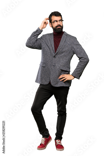 Handsome man with glasses having doubts while scratching head over isolated white background