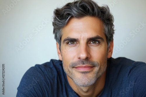 Handsome man with gray hair smiling warmly against a neutral background in a casual shirt