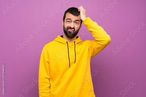 Handsome man with yellow sweatshirt with an expression of frustration and not understanding