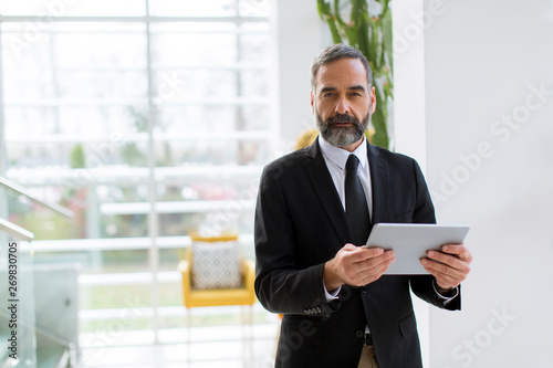 Handsome mature businessman with tablet in the office working, reading or searching something