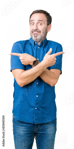 Handsome middle age elegant senior man over isolated background Pointing to both sides with fingers, different direction disagree