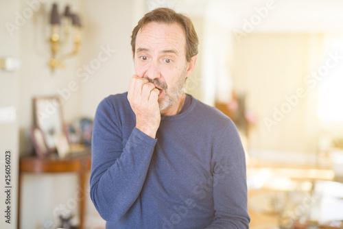 Handsome middle age man at home looking stressed and nervous with hands on mouth biting nails. Anxiety problem.