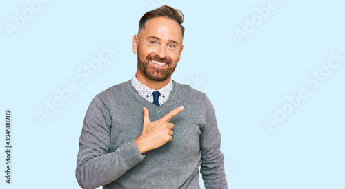 Handsome middle age man wearing business clothes cheerful with a smile on face pointing with hand and finger up to the side with happy and natural expression
