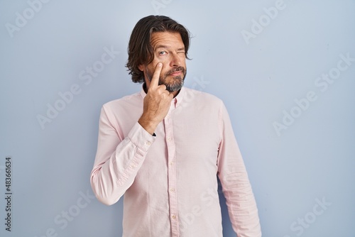 Handsome middle age man wearing elegant shirt background pointing to the eye watching you gesture, suspicious expression