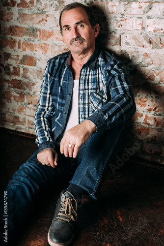 Handsome middle aged man is dressed in a casual clothing. Red brick wall background.