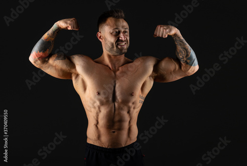 Handsome muscular male bodybuilder on a black background. Strong man.