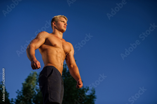 Handsome muscular man posing with blue sky background. Concept of healthy lifestyle
