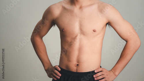 Handsome muscular young man posing against a grey background. male model taking off his shirt on a gray background, body transformation , weight loss, sixpack