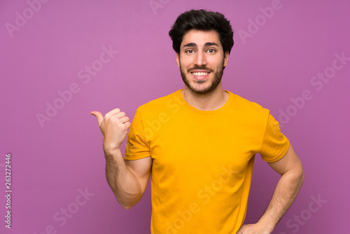 Handsome over isolated purple wall pointing to the side to present a product