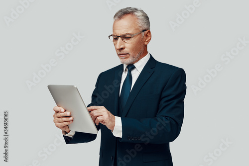 Handsome senior man in full suit using digital tablet while standing against grey background
