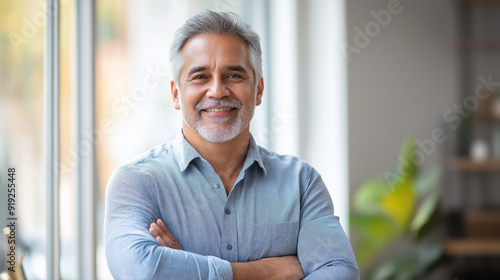 Handsome smiling confident hispanic senior man with crossed arms looking aside. Indian or latin successful mature middle age leader male businessman, business investor in office. Banner, copy space