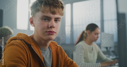 Handsome Student Works on Developing Game in Classroom. Young Man With Green Eyes Looks Intently at Camera While Learning Programming. Digital Education, STEM Education, Creative Skills. Portrait.