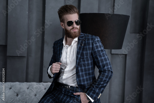 Handsome stylish man in blue suit in a cage and eyewear at home sitting on sofa