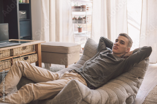 Handsome teenage guy relaxing on modern soft couch at home in living room