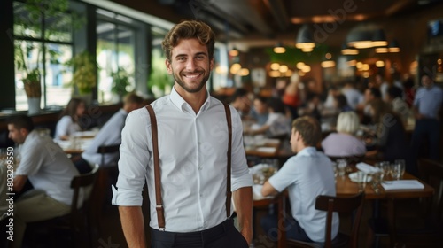 Handsome waiter in a busy restaurant