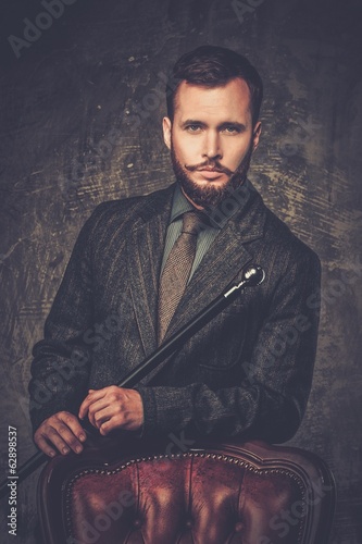 Handsome well-dressed man with stick near chair