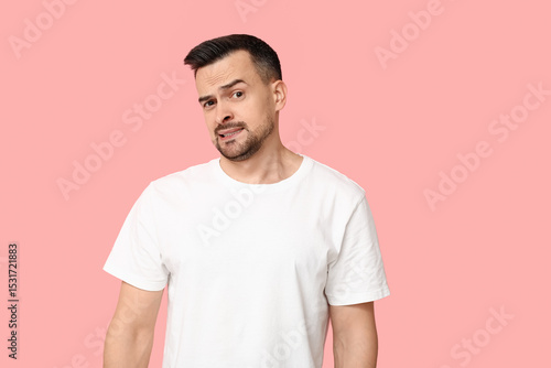 Handsome worried young man on pink background