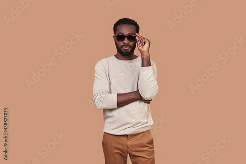Handsome young African man in casual closing adjusting eyewear