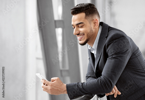 Handsome Young Arab Businessman Using Smartphone In Airport While Waiting In Lounge, Cheerful Middle Eastern Man In Suit Browsing Internet Or Messaging On Mobile Phone While Standing In Terminal