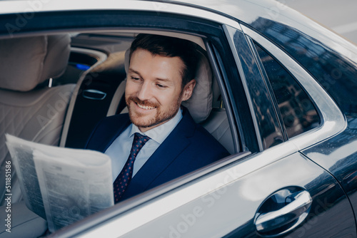 Handsome young banker in smart formal tuxedo suit reads newspaper in luxury auto