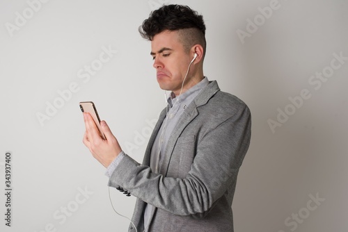 Handsome young businessman holding his selfphone and crying after receiving bad news.