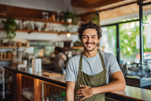 Handsome young caucasian male coffee shop owner standing behind counter and smiling, successful business owner in his coffee shop
