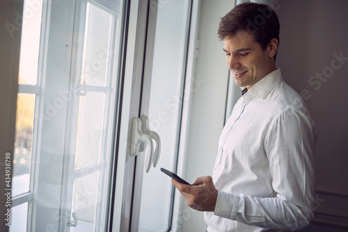 handsome young caucasian man standing by the window in white shirt, looking at his cell phone, smiling