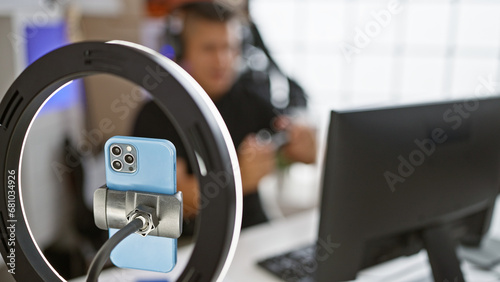 Handsome young latin man gamer immersed in digital gaming, streaming his game live in indoor music studio, seriously concentrated, headset on, speaking into microphone during video call