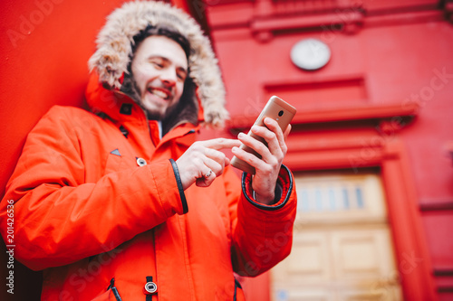 handsome young male student with toothy smile and beard stands on red wall background, facade of educational institution in red winter jacket with hood with fur, Uses finger on screen of mobile phone